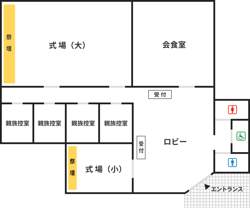 - 保有設備親族控室(4室)/会食室/寺院控室/宿泊設備/シャワー・バスルーム